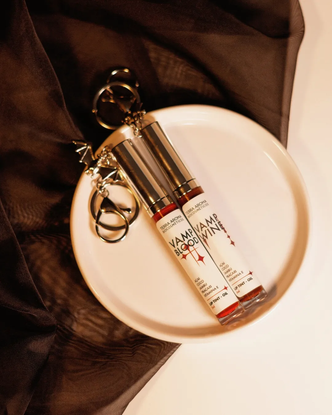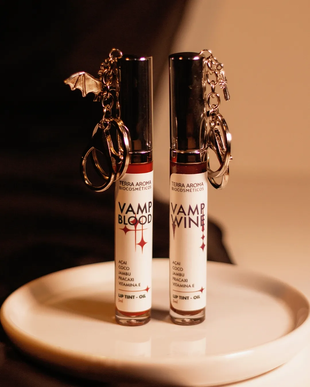 Vamp Blood - Composição: Polyglyceryl-3 ricinoleate, polyglyceryl – 3 oleate, Glyceryl rosinate, sorbitol, euphorbia cerifera candelilla wax, Copernicia cerifera (carnauba) wax, caprylic/capric triglyceride, cocos nucifera oil, tocopheryl acetate, pentaclethra macroloba seed oil, acmella oleracea extract, acid blue 9 aluminum lake, Pigment red 57:1, ci 77491, iron oxide black, (bht, mamona ricinus communis seed oil, cetearyl olivate, sorbitan olivate, sorbitan sesquioleate), mentha piperita oil, sodium benzoate, caprylyl glycol.